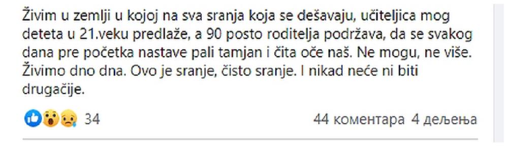 - Živim u zemlji u kojoj na sva sr*** koja se dešavaju, učiteljica mog detata u 21. veku predlaže, a 90 odsto roditelja podržava da se svakog dana pre početka nastave pali tamjan i čita oče naš. Ne mogu, ne više. Živimo dno dna. Ovo je sr***, čisto sr*** i nikada neće biti drugačije - napisala je majka.