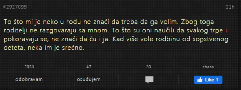 "To što mi je neko u rodu ne znači da treba da ga volim. Zbog toga roditelji ne razgovaraju sa mnom. To što su oni naučili da svakog trpe i pokoravaju se, ne znači da ću i ja. Kad više vole rodbinu od sopstvenog deteta, neka im je srećno".