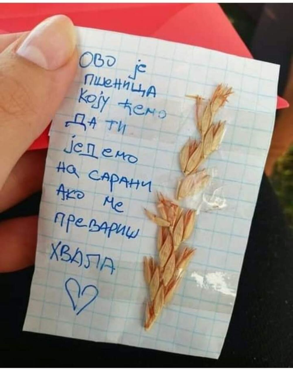 Naime, ona mu je poslala poruku ispisanu na papiru zajedno sa pšenicom.
