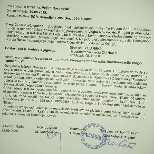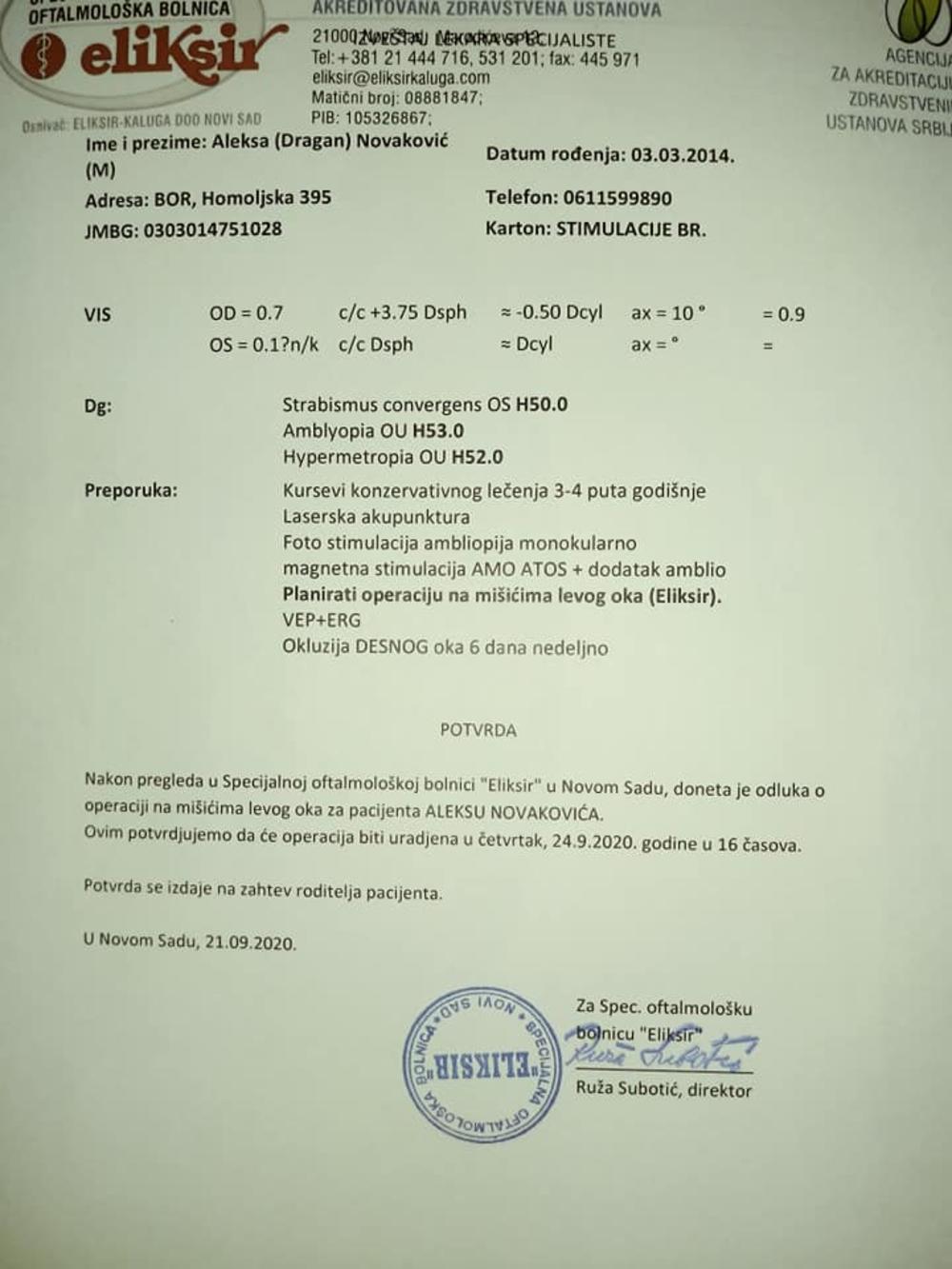- Za oba deteta su nam prepisali nošenje okluzija na zdravom oku kako bi se bolesno oko što više stimulisalo, a za Aleksu je to bilo nošenje po ceo dan, naočare i kurseve konzervativnog lečenja 3-4 puta godisnje metodama akademika dr Leonida F. Linjika i akademika dr. Svjatoslava N. Fjodorova i Ocne klinike "Fjodorov" u Kalugi i Laserske akademije nauka Ruske Federacije koje se jedino u Srbiji rade u Specijalnoj oftamoloskoj bolnici "Eliksir" u Novom Sadu. Bez imalo dvoumljenja, iako je za nas budžet to bila velika svota novca jer je suprug jedini zaposleni u porodici, pristali smo jer nam je to bila jedina "slamka spasa". Nakon četvrtog ciklusa prepisanih stimulacija, oštrina vida kod Alekse se sa 2% popravila na 10% na levom oku, a na desnom sa 60% je oštrina vida stigla na 90%. Veljku se smanjio ugao skretanja oka. Za 17 maj je za Aleksu bila zakazana operacija strabizma u Kalugi u bolnici "Fjodorov" no zbog situacije sa korona pandemijom nismo mogli otputovati jer su svi letovi obustavljeni. Operaciju je bilo potrebno obaviti što pre, i nadali smo se svi da će se situacija u svetu stabilizovati i da će se uskoro otputovati za Rusiju. Kako se to ni do danas nije desilo, bolnica "Eliksir" je donela odluku da se hitne operacije pacijenata ipak obave ovde, i da ce operacije vršiti dr Molotkova koja je doputovala preko Istambula, objašnjava Tamara za Espreso.co.rs.