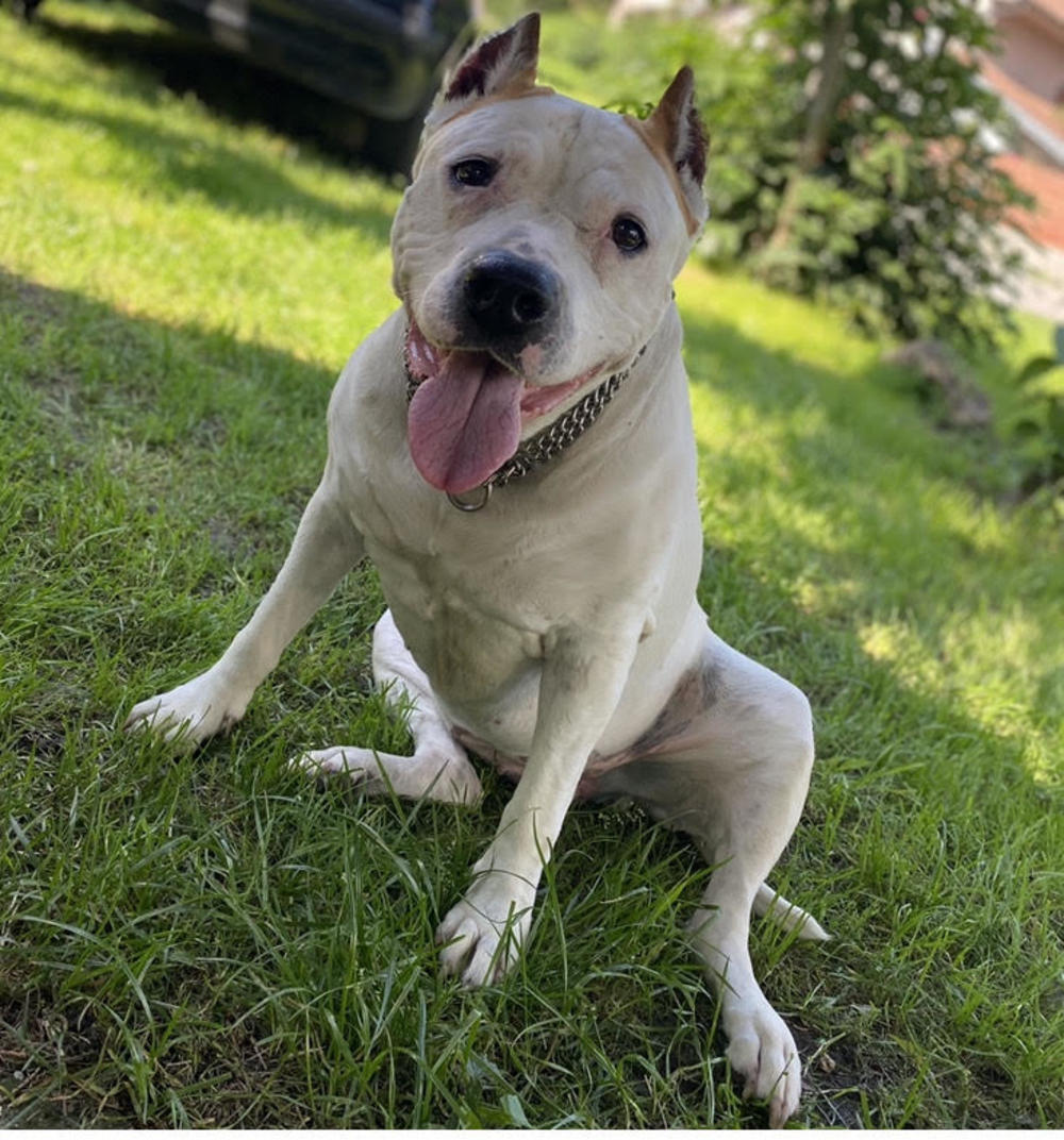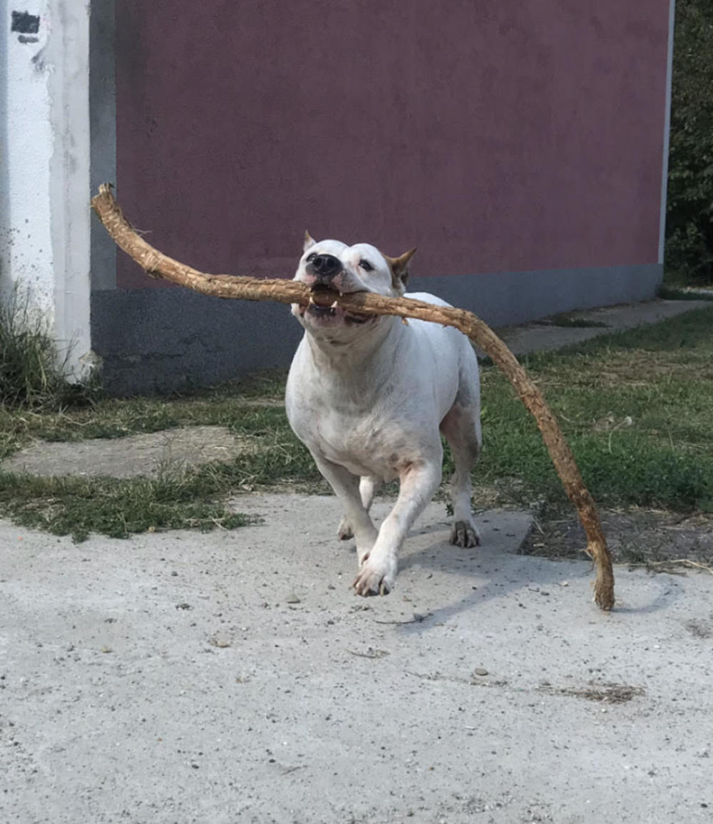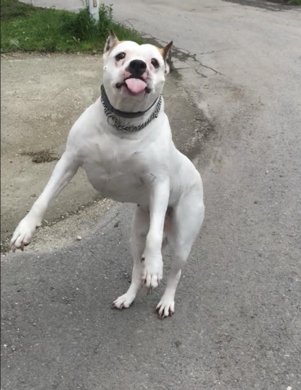 ,,Ima 12 i po godina, rasa je staforda, ali po obliku njuške očito ukrštena sa putbulom. Sve je samo ne opasan pas. Petoro dece iz kraja je prohodalo uz nju, svi je vole, komšije se više javljaju njoj nego nama.
