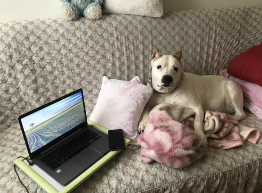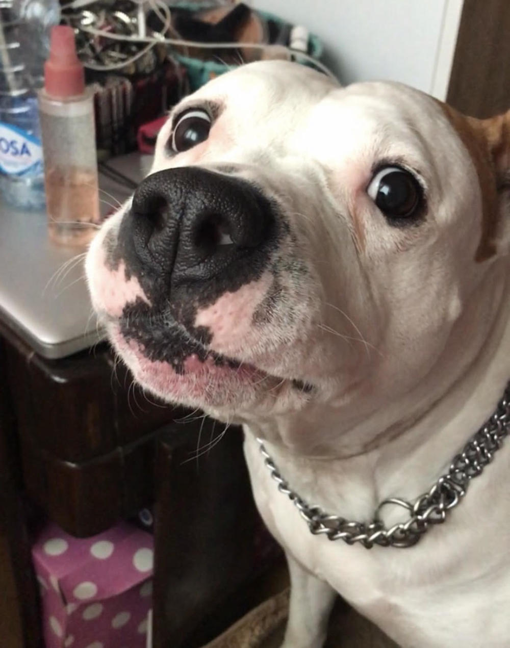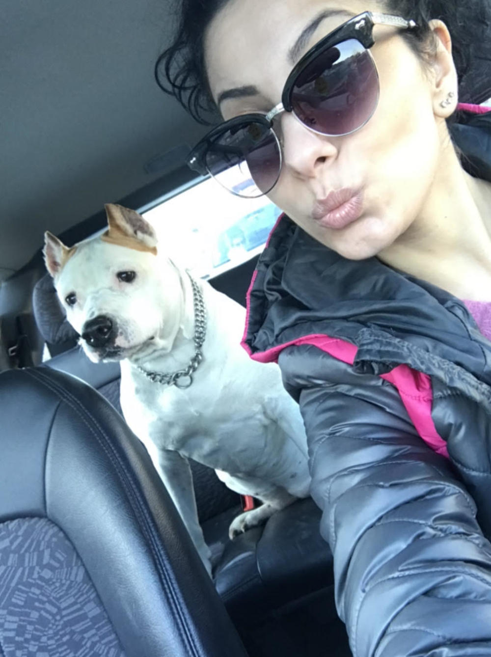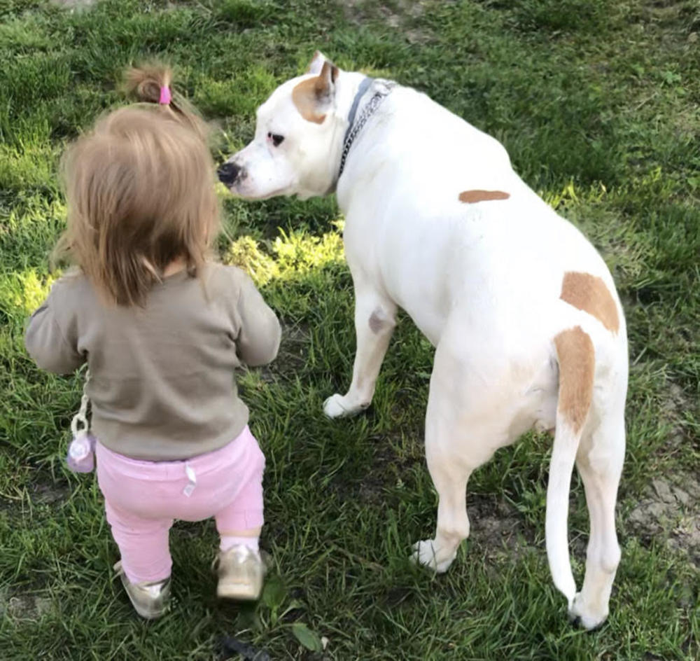 ,,Ima 12 i po godina, rasa je staforda, ali po obliku njuške očito ukrštena sa putbulom. Sve je samo ne opasan pas. Petoro dece iz kraja je prohodalo uz nju, svi je vole, komšije se više javljaju njoj nego nama.
