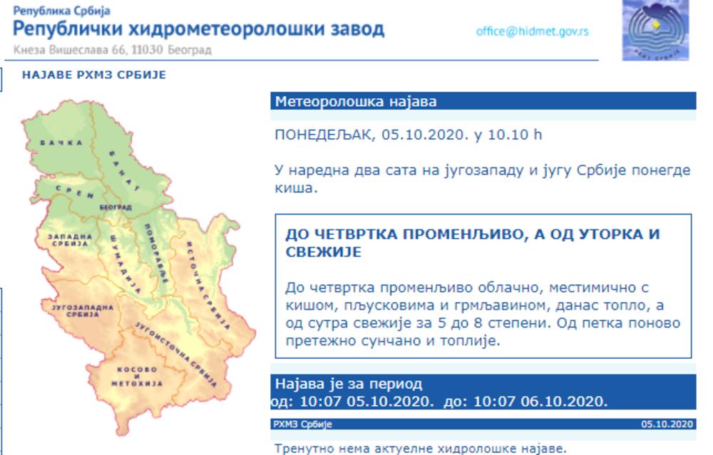U naredna dva sata na jugozapadu i jugu Srbije se u pojedinim predelima očekuje kiša