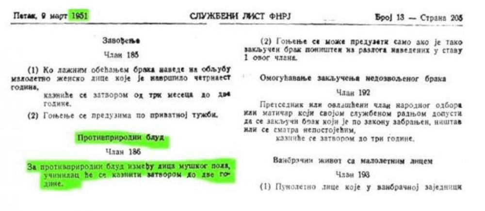 U Krivičnom zakoniku Jugoslavije iz 1951. za "protivprirodni blud" između dva lica muškog pola bila je predviđena kazna. Pogledajte šta ih je čekalo za “blud“.