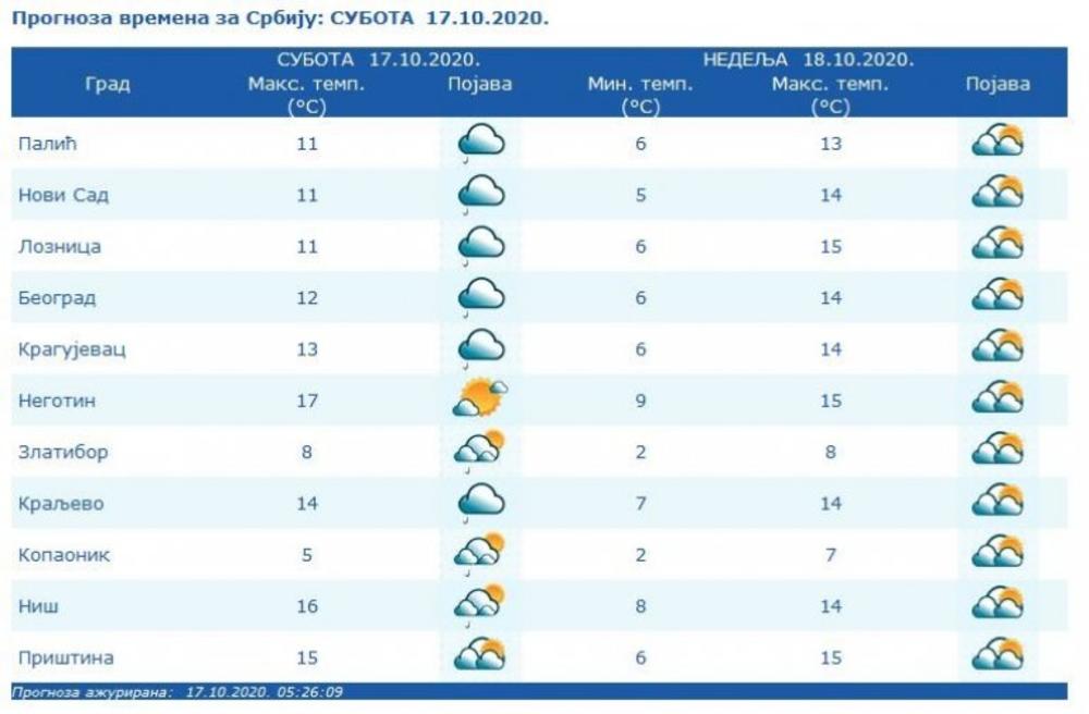 Danas će u Srbiji biti pretežno oblačno i hladno, mestimično sa slabom kišom, osim na krajnjem jugu zemlje gde će biti malo i umereno oblačno i suvo, a u Negotinskoj Krajini pretežno sunčano.