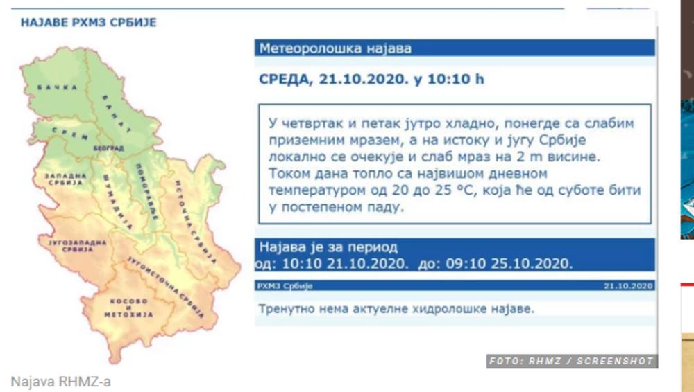 Prema upozorenju koje je izdao RHMZ, danas, sutra i u petak, preko dana nas očekuju temperature između 20 i 25C tokom dana, dok će jutra uglavnom biti prohladna sa temperaturom koja će se kretati od nekih 9 do 10 stepeni, a u pojedinim delovima Srbije, na jugu i istoku, lokalno se očekuje slab mraz.