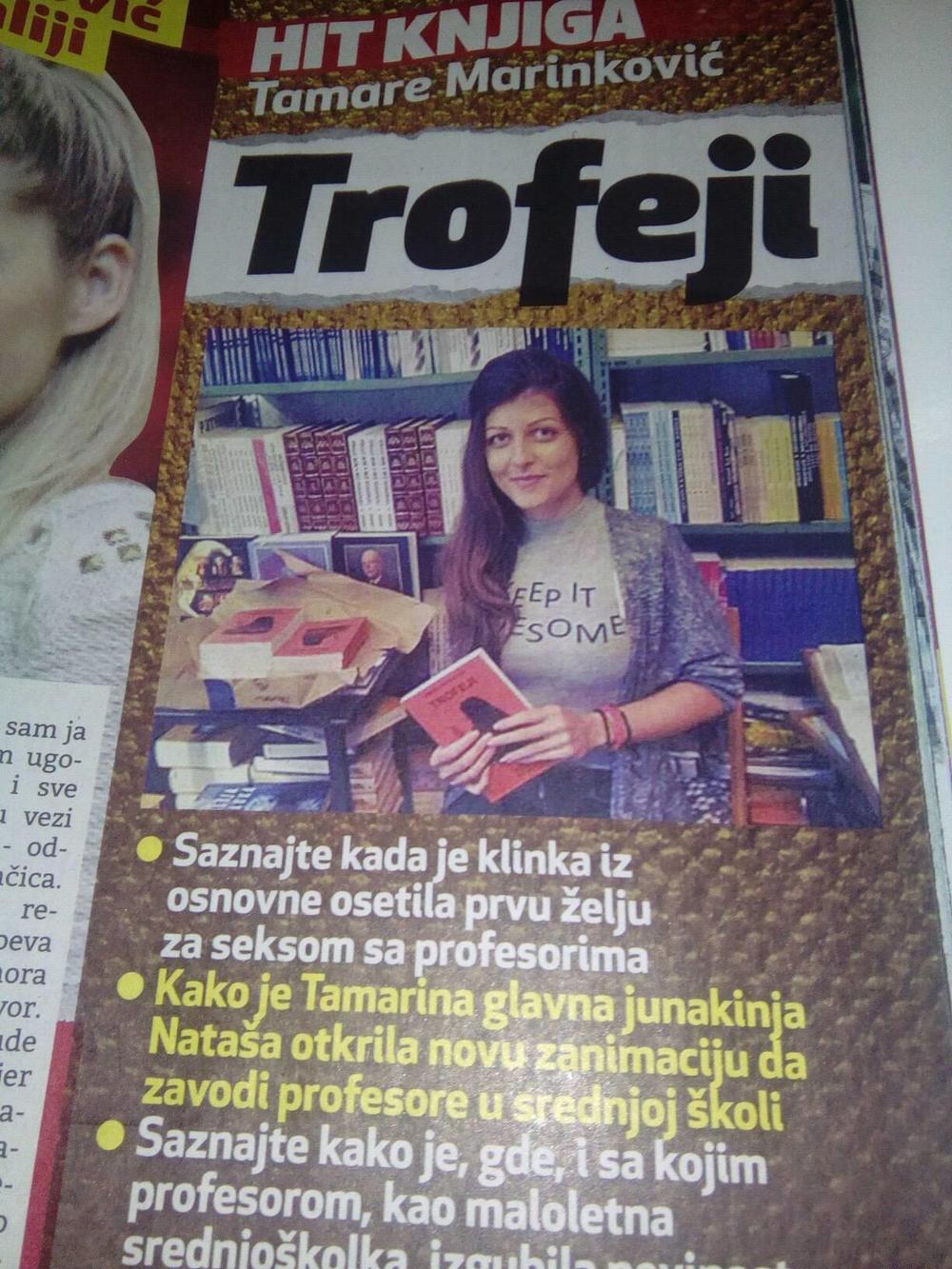 Malo je njih koji nisu čuli za knjigu "Trofeji" kojom je Tamara Marinković izazvala buru u srpskoj javnosti. Uzbune je bilo i u školi u Zemunu, koju je pohađala, i u medijima, ali nju to nije mnogo pogađalo.