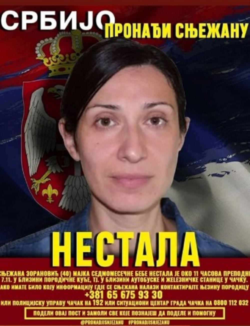 "Snježanu smo poslednji put videli pre 10 dana i otad je svaki dan tražimo. Tokom ovih deset dana dobili smo nekoliko informacija koje su se ispostavile kao netačne. Kako vreme odmiče njen nestanak mi je sve čudniji, jer zašto bi majka sedmomesečne bebe, koja je psihički vrlo stabilna i odogvorna, otišla bez traga?"