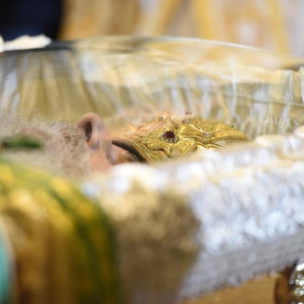 Kovčeg sa telom patrijarha srpskog Irineja nalazi se u sredini hrama i potpuno je zatvoren, a u delu glave i grudi prekriven je staklom.