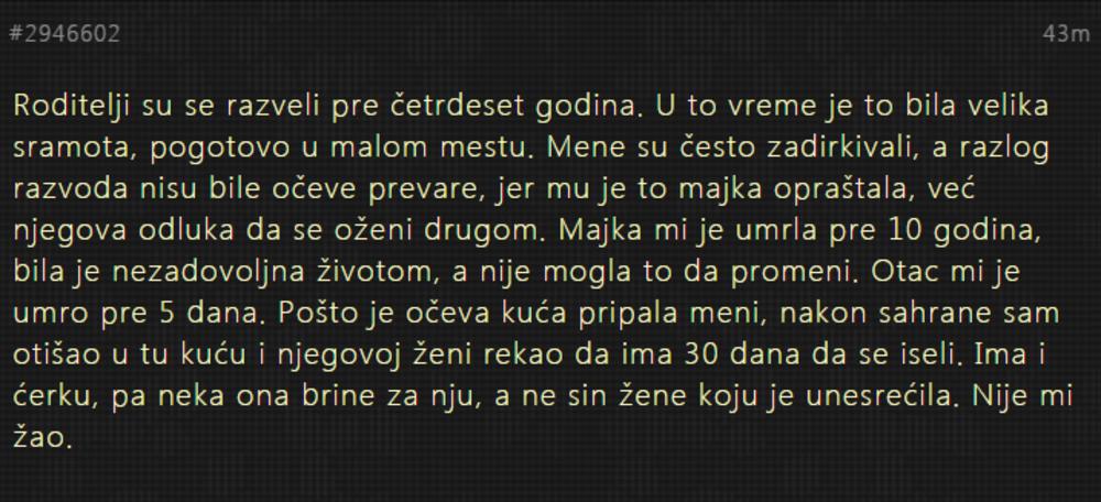 "Roditelji su se razveli pre četrdeset godina. U to vreme je to bila velika sramota, pogotovo u malom mestu. Mene su često zadirkivali, a razlog razvoda nisu bile očeve prevare, jer mu je to majka opraštala, već njegova odluka da se oženi drugom. Majka mi je umrla pre 10 godina, bila je nezadovoljna životom, a nije mogla to da promeni. Otac mi je umro pre 5 dana. Pošto je očeva kuća pripala meni, nakon sahrane sam otišao u tu kuću i njegovoj ženi rekao da ima 30 dana da se iseli. Ima i ćerku, pa neka ona brine za nju, a ne sin žene koju je unesrećila. Nije mi žao. "