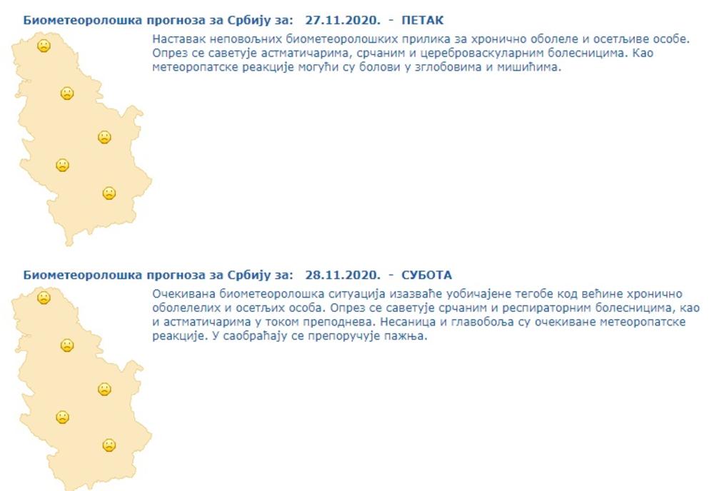 Ništa bolje neće biti ni za vikend. Meteorolozi su saopštili da će se nastavljaju nepovoljne biometeorološke prilike za hronično obolele i osetljive osobe. Oprez se savetuje astmatičarima, srčanim i cerebrovaskularnim bolesnicima. Kao meteoropatske reakcije mogući su bolovi u zglobovima, nesanica, glavobolja.