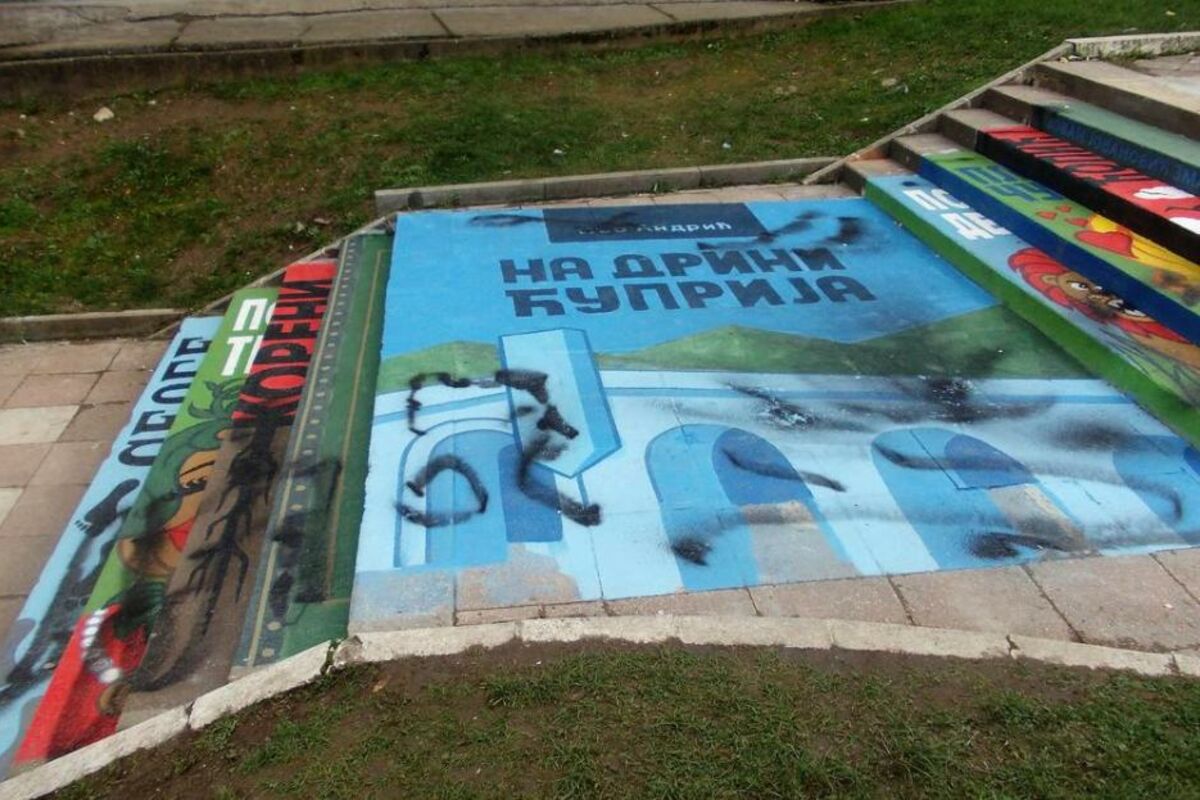 Tokom prošle noći preko na stepenicama oslikanih korica Andrićeve "Na Drini ćuprija" i bočnim stranama stepenika naslova đačke lektire, "Koreni" Dobrice Ćosića, "Seobe" Miloša Crnjanskog, Sterijine "Pokondirene tikve" i još nekih, ostavljene su škrabotine koje je nemoguće ukloniti i sav mural je upropašćen.