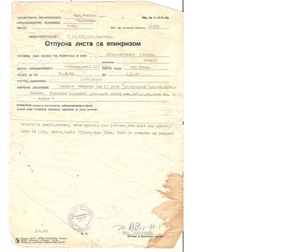 Nakon nekoliko dana poštom nam šalju otpusnu listu i otpremnicu leša. Na svakom dokumentu piše umesto imena Milosavljević muško, novorođenče.