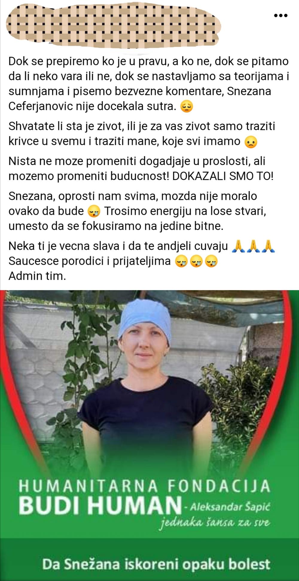 - Dok se prepiremo ko je u pravu, a ko ne, dok se pitamo da li neko vara ili ne, dok se nastavljamo sa teorijama i sumnjama i pišemo bezvezne komentare, Snežana Ćeferjanović nije dočekala sutra. Shvatate li šta je život, ili je za vas život samo tražiti krivce u svemu i tražiti mane, koje svi imamo?