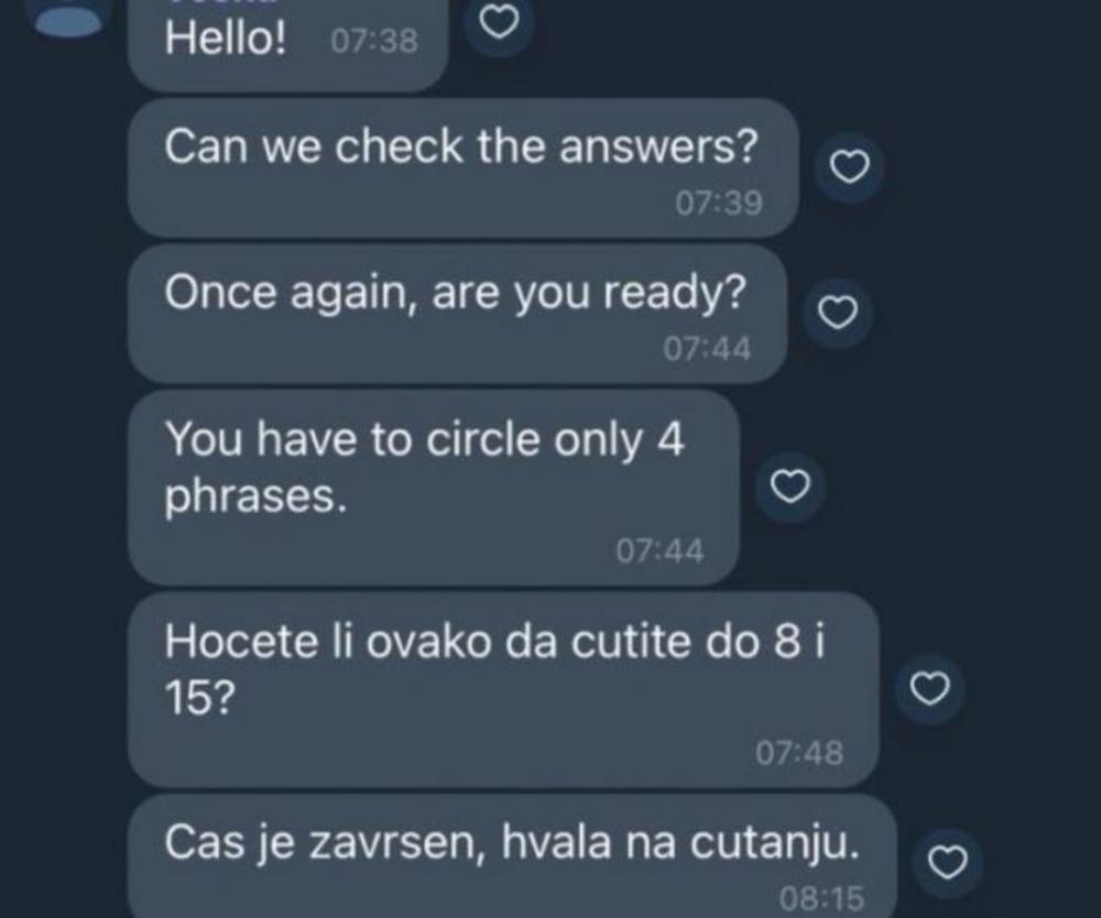U prepisci sa Vibera vidi se da je profesorka engleskog jezika pokušala da održi čas na engleskom, kao i u ranijim situacijama. Međutim, kada je videla da niko ne odgovara, protivno svojim pravilima, obratila im se na srpskom, a onda i okončala čas - bez ikakve povratne reakcije učenika.