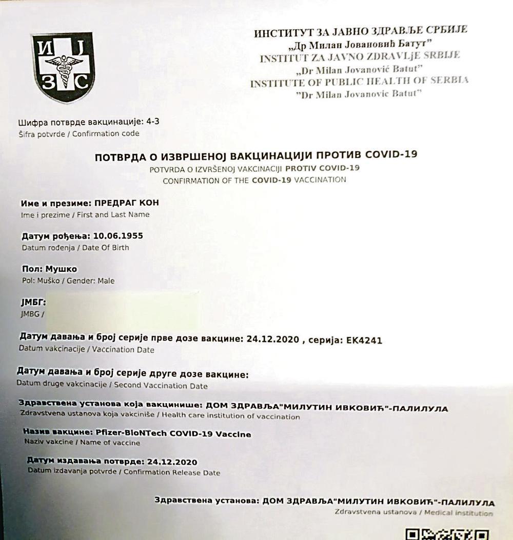 PROŠLO JE VIŠE OD ČETIRI SATA, NEMAM REAKCIJU NA VAKCINU, NI OTOK! Dr Kon pokazao POTVRDU O IZVRŠENOJ VAKCINACIJI!