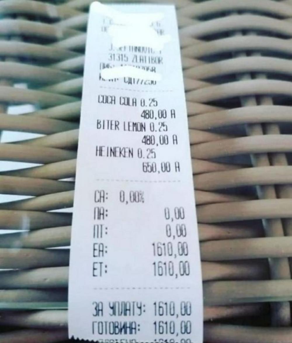 Na računu sa Zlatibora navedeno je da koka-kola i biter lemon koštaju 480 dinara, dok je pivo čak 650. Za tri pića ovi gosti dali su 1610 dinara.