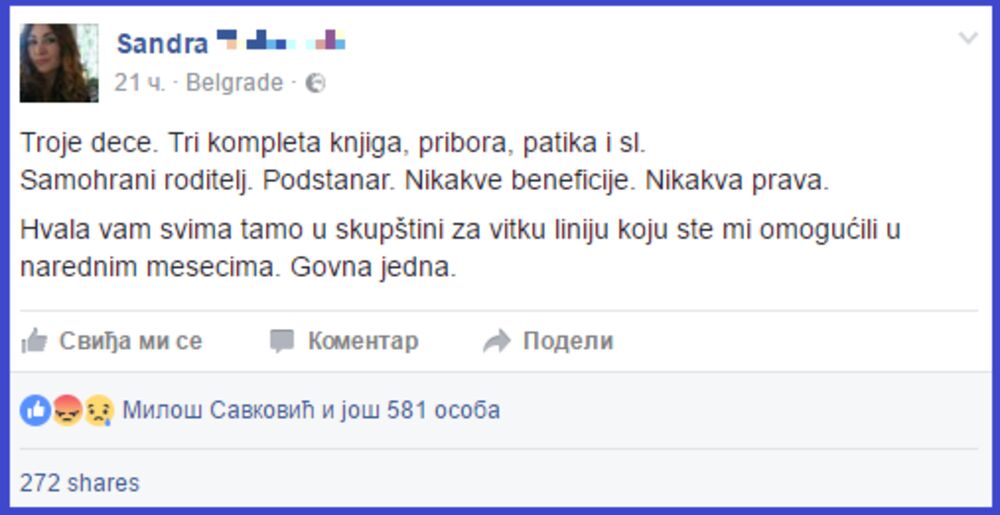 - Troje dece. Tri kompleta knjiga, pribora, patika i sl.Samohrani roditelj. Podstanar. Nikakve beneficije. Nikakva prava. Hvala vam svima tamo u skupštini za vitku liniju koju ste mi omogućili u narednim mesecima. Govna jedna.