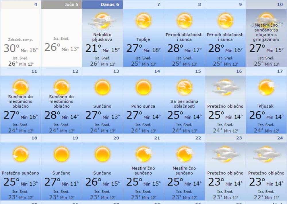 Prema dugoročnoj prognozi lepo i toplo vreme biće sve do kraja meseca, osim što se u nedelju u pojedinim delovima zemlje očekuju prolazni pljuskovi sa grmljavinom.
