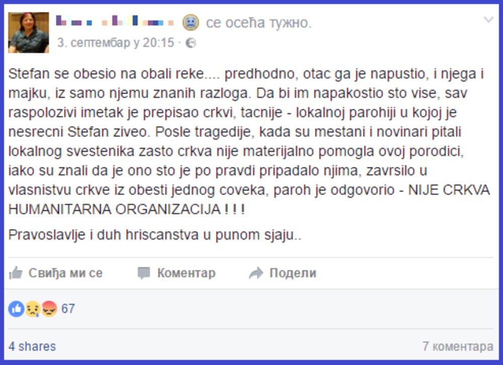 Status jedne korisnice Fejsbuka poveo je oštru polemiku o ovoj temi, jer je ona napisala da crkva, kojoj je otac dečaka prepisao imovinu, nije htela da pomogne napaćenoj majci s detetom!