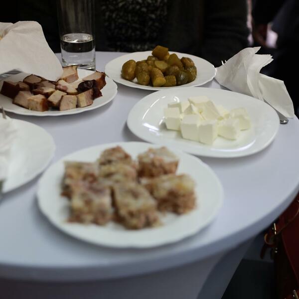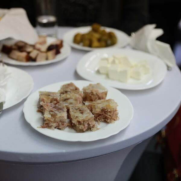 Dočekalo nas je posluženje - pihtije, suvo meso, sir, kiseli krastavčići...