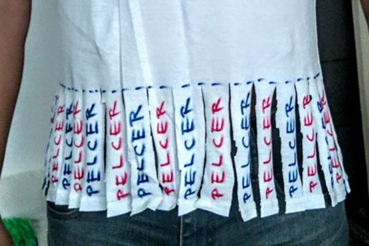 Ipak, Nišlija je došao na fenomenalnu ideju. Naime, on je pojas majice isekao na froncele i nas svakom delu napisao "pelcer". Flomasterom je označio delove majice predviđene za cepanje.