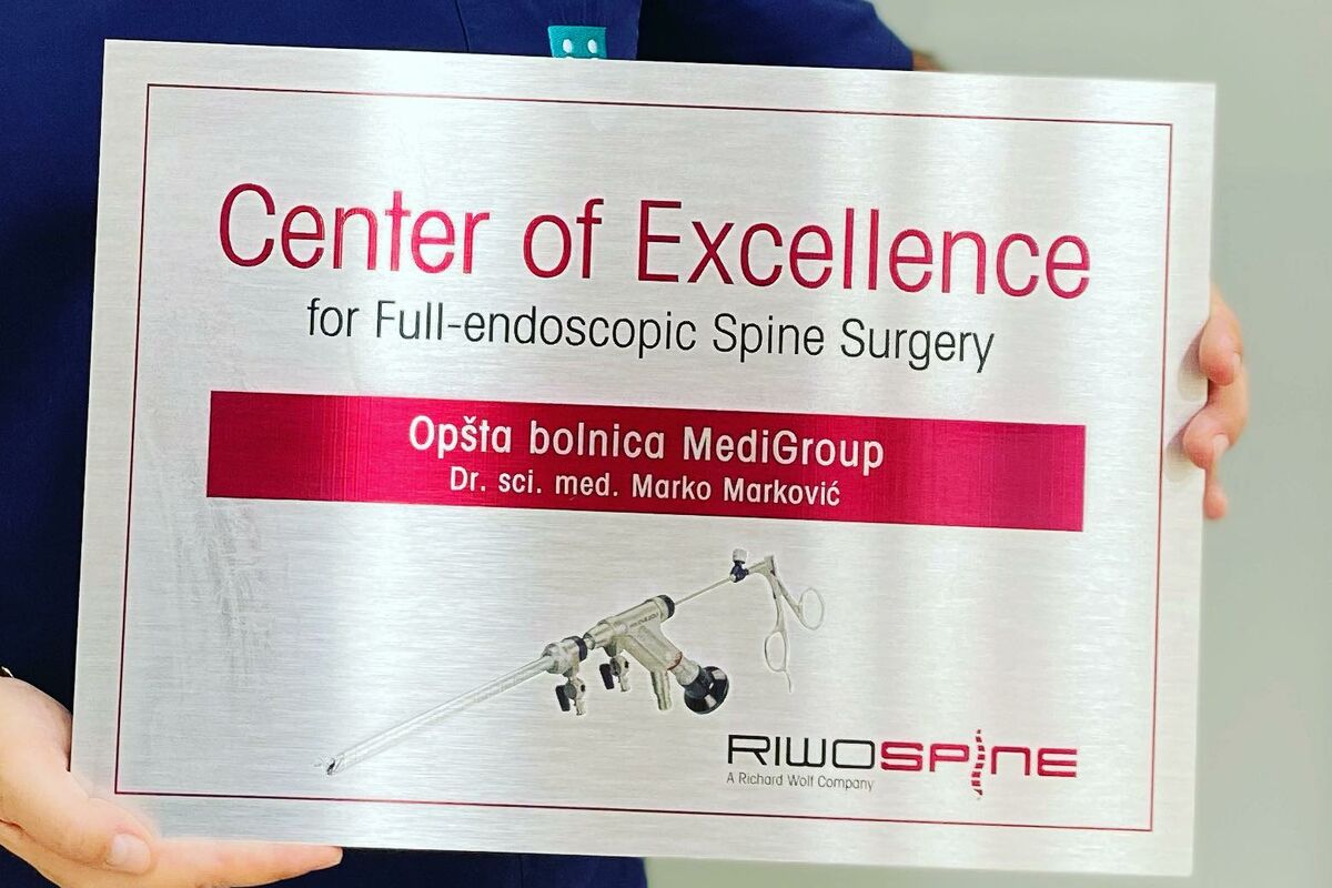 MediGroup Opšta bolnica zvanično je postala jedan od 20 Centara izvrsnosti na globalnom nivou za kompletno-endoskopsku minimalno invazivnu hirurgiju kičme. Nosilac ovog centra dr sci. med. Marko Marković, specijalista neurohirurgije i pionir minimalno invazivne hirurgije kičme u Srbiji i region, ističe da je to veliko, objektivno i zvanično priznanje. "Kompletno endoskopske operacije zahtevaju nešto duži period učenja zbog drugačije i do tada nepoznate operativne tehnike, stoga se ne rade u velikom broju centara, a ni od strane velikog broja doktora. Velika nam je čast što smo izabrani kao jedan od 20 centara u svetu, jer kada su u pitanju ovako visoko učestala oboljenja kičme, minimalno invazivna operacija je trenutno najbolji način njihovog rešavanja", ističe dr Marković.
