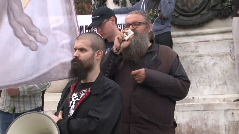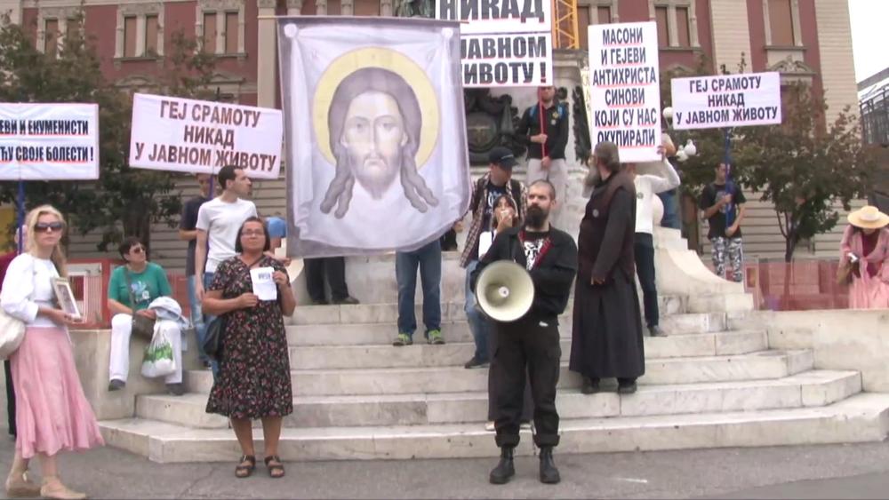 Skupu su prisustvovali ljudi u mantijama i vernici koji nosili ikone i "anti-gej" transparente i uzvikivali parole.