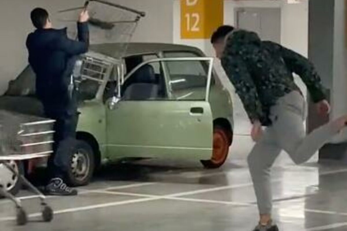 Na snimku se vidi kako mladići uzimaju kolica i bacaju na parkirana vozila, a u komentarima ispod klipa navodi se da je reč o garaži u jednom od najposećenijih tržnih centara u Beogradu.