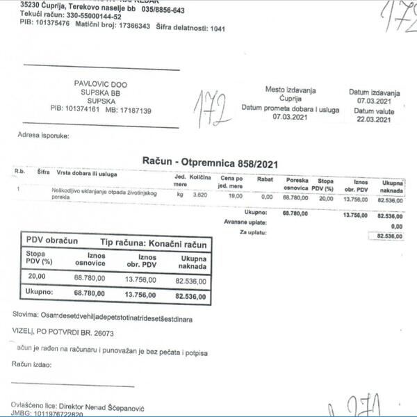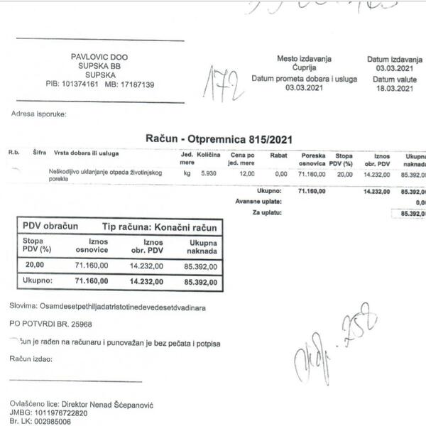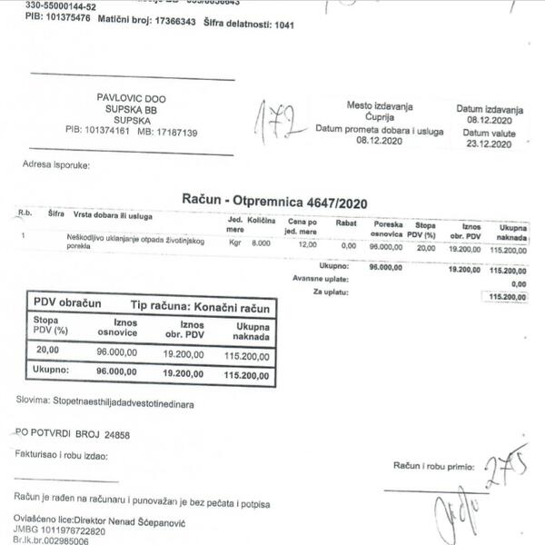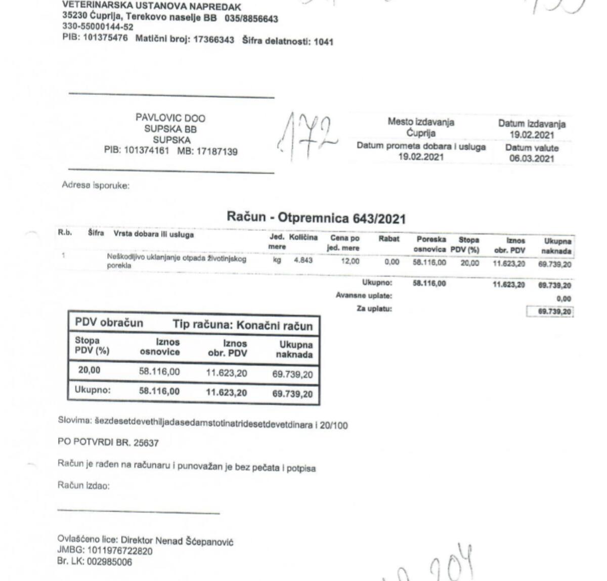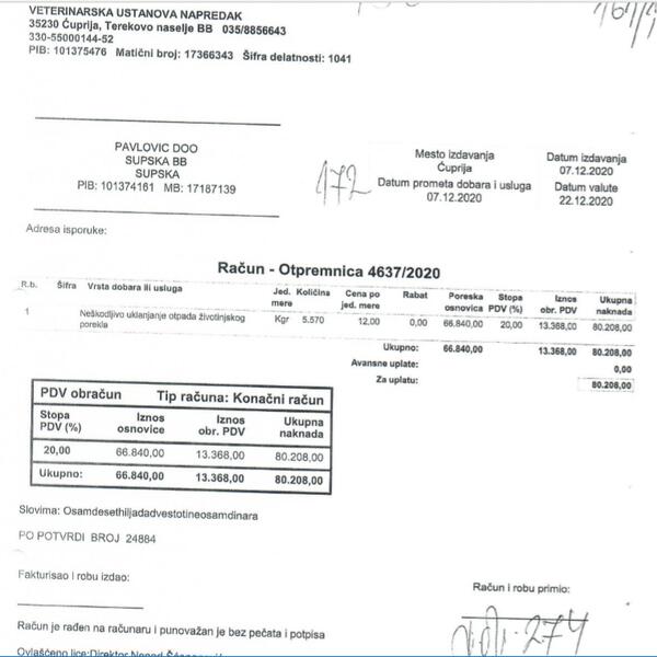 Kao što je u tekstu navedeno, Pavlović nam je dostavio dokumentaciju u kojoj se vidi da su uginuća otpremljena u kafileriju, a u nastavku ćemo jedan od dokumenata i prikazati.