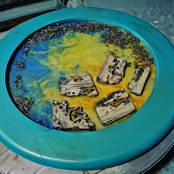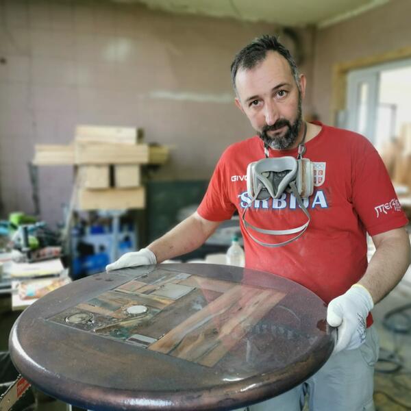 „Uvek radim samo sa prirodnim materijalima, kuvana orahovina stiže u grubom nedefinisanom obliku i od njih se formira sto, svaki je drugačiji i ima svoju poentu. Uz orahovinu, materijal koji se koristi je epoksivna smola, prirodni gradivni materijali. Poseban akcenat stavlja se na ploču, svaka je priča za sebe. Izlivanjem smole prave se oblici, često su to pejzaži poput reka, planina, mora. Postoje i elementi koje ugradim kao deo svog života, moje retro emocije što je bio slučaj kad sam ugradio par časovnika”, priča ovaj maštoviti umetnik za RINU.