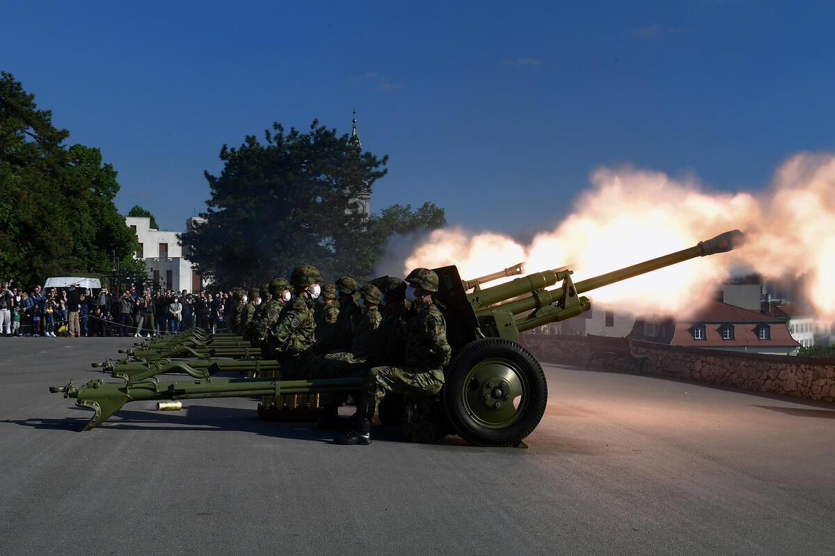 On je podsetio da su mnogi od tih boraca, u vreme kada su se latili oružja silom prilika, i krenuli u borbu za slobodu bili gotovo deca, koja nisu marila ni za svoje živote. - Naš zadatak je da se borimo da tu slobodu očuvamo, da ne zaboravimo njihove žrtve i koliko je ta sloboda skupo koštala Srbiju. Ali i, isto tako, da jačamo našu vojsku, da ulažemo novac u njeno opremanje i da jačamo njen kadar. Da se potrudimo da se uvek setimo da samo jaka vojska znači jaku Srbiju, a samo jaka Srbija može da garantuje prospertitet i napredak svojim građanima – poručio je ministar Stefanović. Pripadnici Garde Vojske Srbije na Kalemegdanu su izvršili počasnu artiljerijsku paljbu ispaljivanjem deset plotuna iz šest artiljerijskih oruđa. Počasnoj paljbi prisustvovao je i komandant Garde general-major Milomir Todorović. Paljbi je prethodilo podizanje državne zastave i intoniranje himne, nakon čega je pročitana Naredba predsednika Republike Srbije i vrhovnog komandanta Vojske Srbije Aleksandra Vučića, na osnovu koje su pripadnici Garde izvršili počasnu paljbu. Dan pobede nad fašizmom obeležava u znak sećanja na 9. maj 1945. godine, kada je bezuslovnom kapitulacijom Nemačke okončan Drugi svetski rat u Evropi.