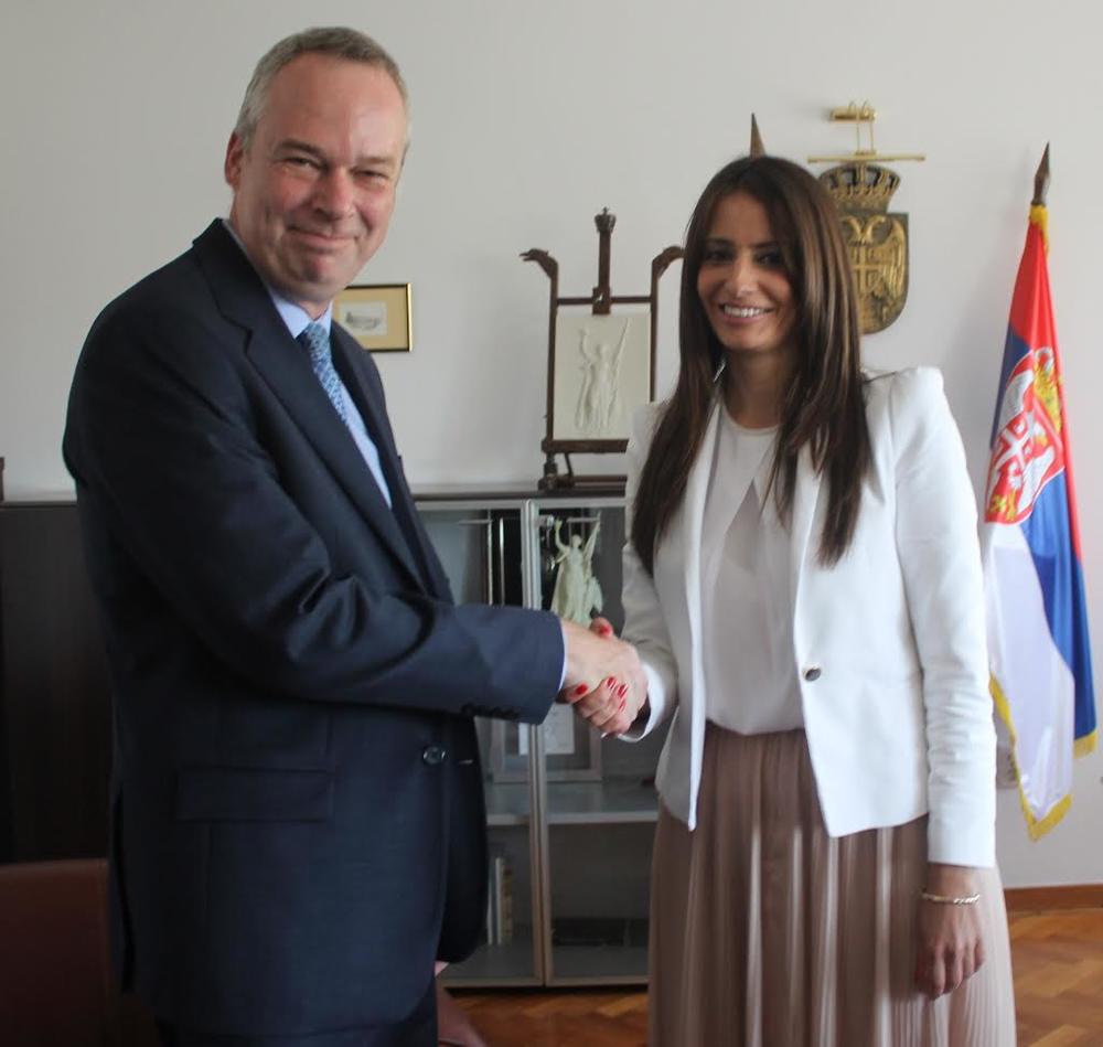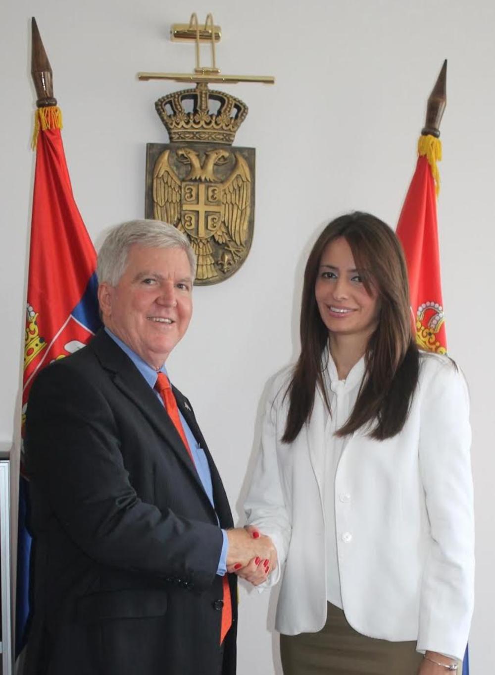Ambasador Sjedinjenih Američkih Država u Srbiji, Kajl Skot nije mogao da sakrije osmeh na licu kada je uhvatio ministarkinu ruku i sudeći po ovoj fotki, nije imao nameru da je pusti. Obraščići su mu se zacrveneli, a krv mu je prostrujala duž celog tela.