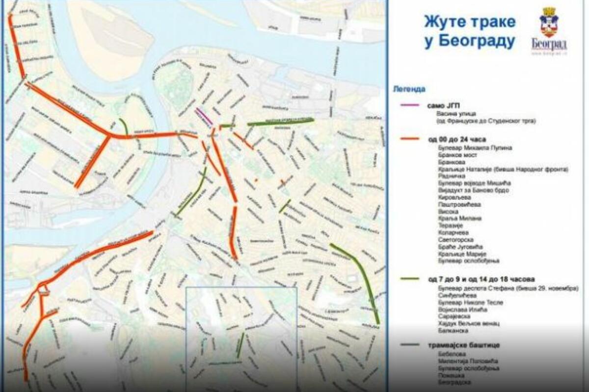 Naime, postoje ulice u kojima je vožnja žutom trakom dozvoljena u određenim delovima dana, tačnije, zabranjena je samo šest sati dnevno, odnosno u špicevima