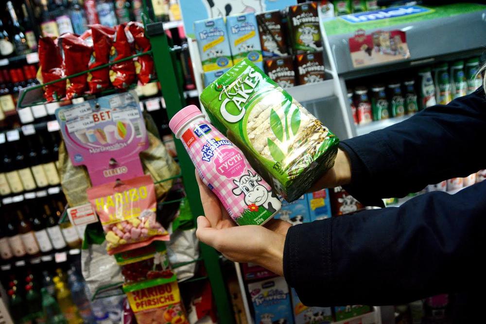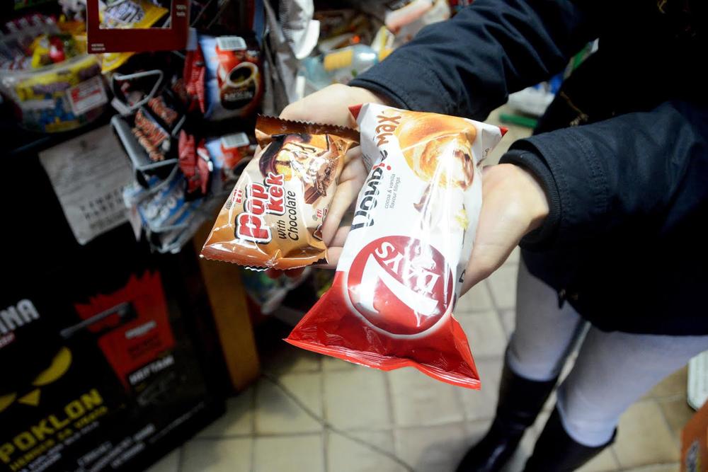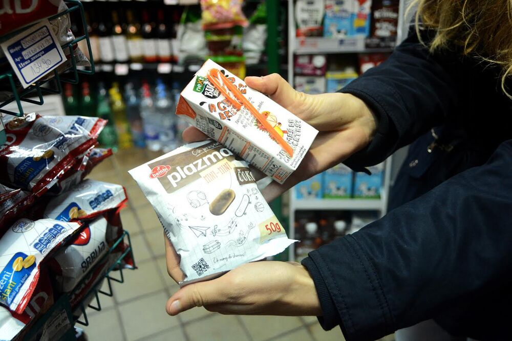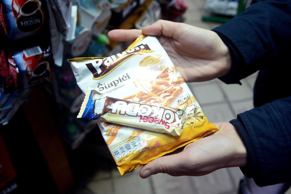 U privatnoj prodavnici u blizini jedne osnovne škole, prodavačica nam je odabrala kombinacije hrane koje iznose ukupno 100 dinara. Ona kaže da deca uglavnom kupuju čokoladice, čips, smoki i druge grickalice.