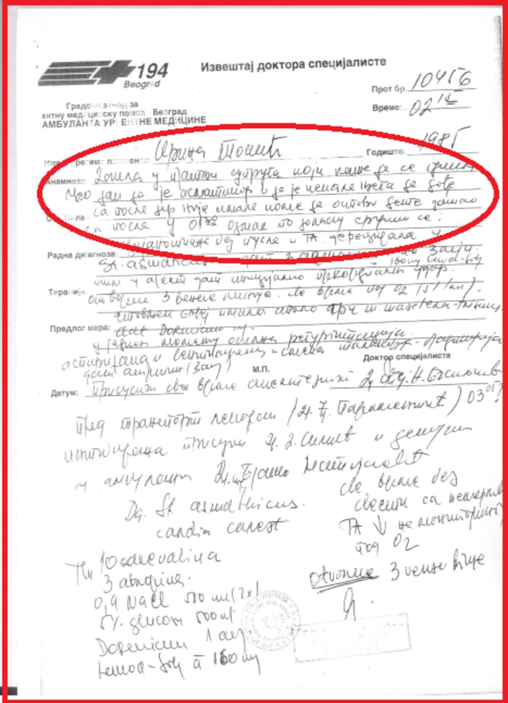- Napisali su da je Ilina došla u pratnji supruga koji je rekao da joj je ceo dan bilo loše. Takođe su napisali da nije mogla ranije da dođe kod lekara iako joj je bilo loše jer je morala da čeka mene da dođem sa posla, i zato što nema ko da čuva dete.