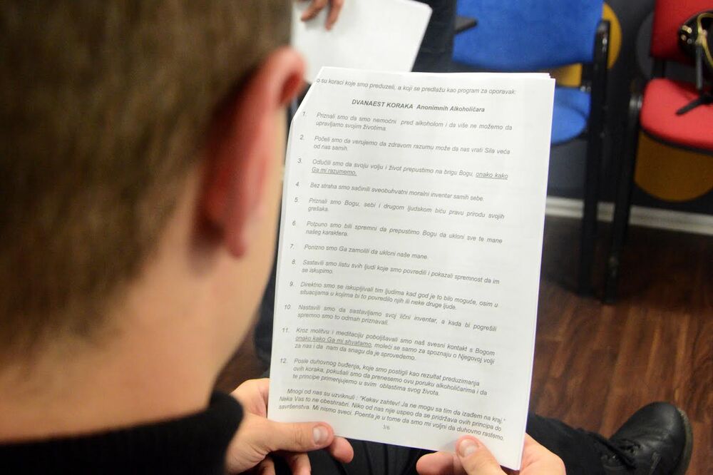 Došao je taj trenutak. Sastanak počinje u pola šest. Stižemo ranije, a ispred nas dočekuje Dragan, gospodin sa kojim sam dogovorila sastanak. Sprovodi nas u malu prostoriju, veselih boja. Jedini nameštaj je stočić i stolice poređane uza zid, a na svakoj od njih lista sa programom. Tu je i "12 koraka AA". Čitam stavke jednu po jednu i ne verujem. Prva je već šok.
