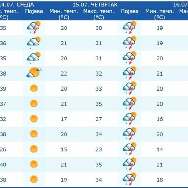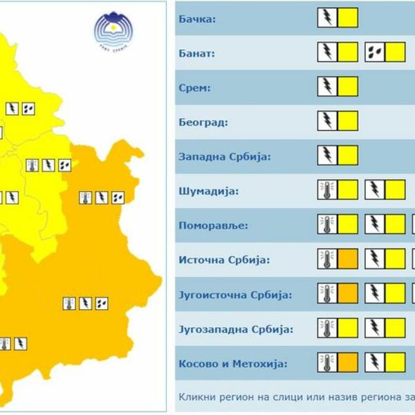 - Danas na području Srbije veoma toplo sa najvišom temperaturom od 35 do 38 °C, lokalno i do 40 °C. Na području Beograda maksimalna temperatura oko 38 °C. Sutra će se veoma toplo vreme zadržati samo na jugu i istoku Srbije sa maksimalnom temperaturom oko 36 °C - stoji u prvom upozorenju.