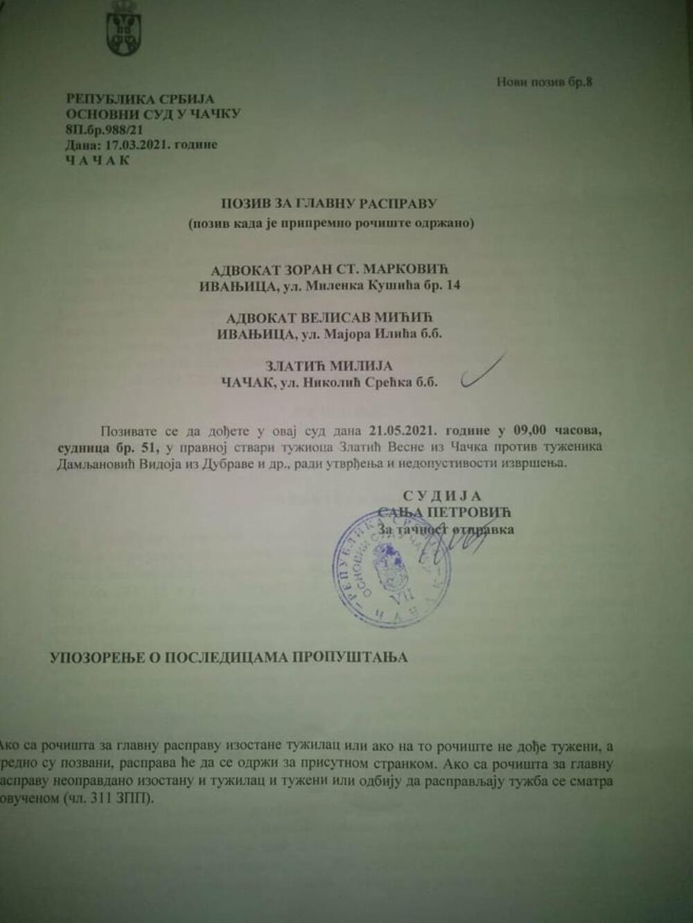 - Izvršni postupak u predmetu II 415/20. koje sprovodi izvršitelj M.I. iz Čačka, po predogu poverioca D.V. prema Z.M., a koje je usmereno prema Zlatić Vesni gde se traži da se iseli iz svoje nepokretnosi u Čačku je protivzakonito i protivustavno jer ne postoji pravni osnov za prednje radnje. Zlatić Vesni je shodno pravosnažnoj presudi Osovnog suda Čačak utvrđeno pravo svojine sa udelom 1/2 idealno, na predmetnoj nepokretnosti koja je predmet izvršenja-iseljenja, tako da je ista vlasnik iste, a obzirom da se radi o idealnom udelu, taj udeo nije fizički odvojen, te se ne vidi kako izvršenje moze da se sprovede. Simptomatično je da je iselenje zakazano dan pre suđenja po tužbi Zlatić Vesne prema poveriocu radi nedopuštenosti izvršenja čija parnica je zakazana za 23.7.2021. U svakom slučaju, izvršitelj je morao da usvoji prigovor trećeg lica iz razloga postojanja pravosnažne oresude kojom se dokazuje pravo svojine trećeg lica na predmetu izvršenja shodno članu 108 i postupak obustavi. Zlatić Vesna je inače prošle godine operisana od kancera, te svako postupanje izvršitelja može dovesti do nesagledivih posledica po njen život i telo. O ovome je obavešteno Ministarstvo pravde i Komora izvršitelja čiji odgovor nisam dobio, objašnjava Marković.