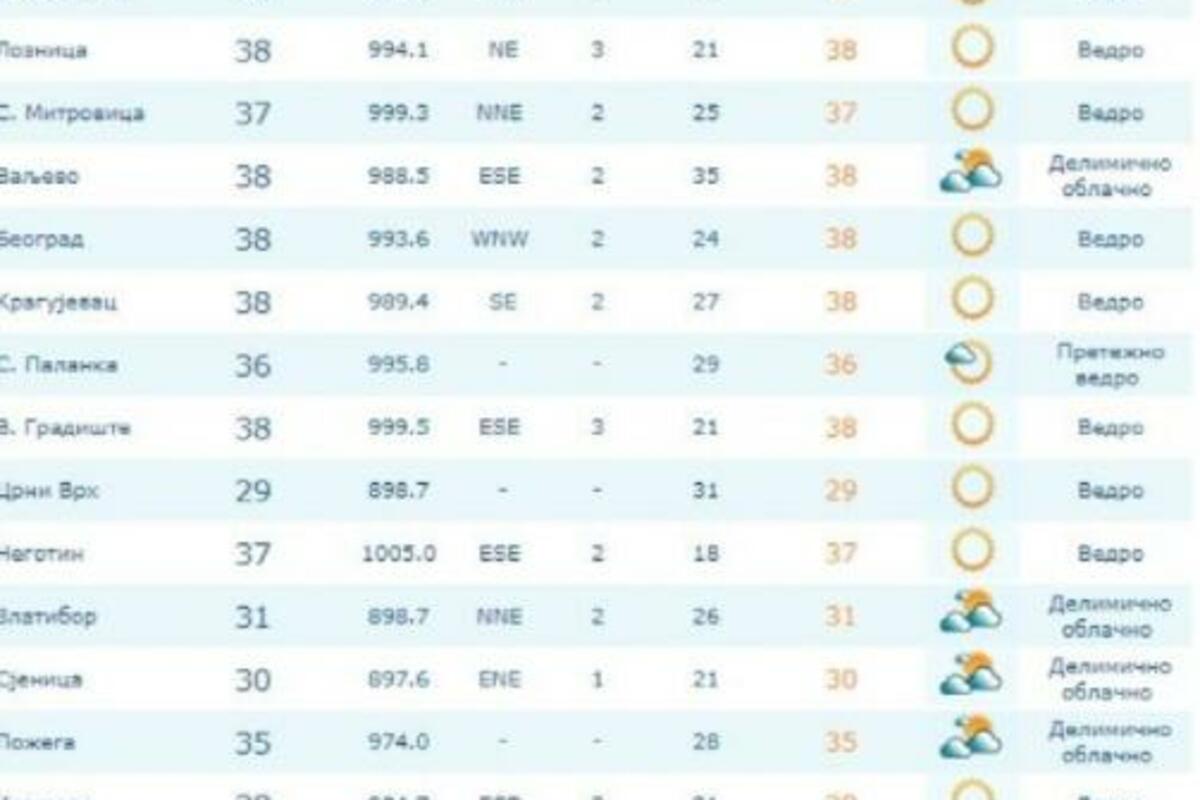 Kako je naveo RHMZ, 38 stepeni je bilo u Beogradu, Loznici, Kikindi, Valjevu, Kraljevu, Velikom Gradištu, B. Karlovcu i Negotinu