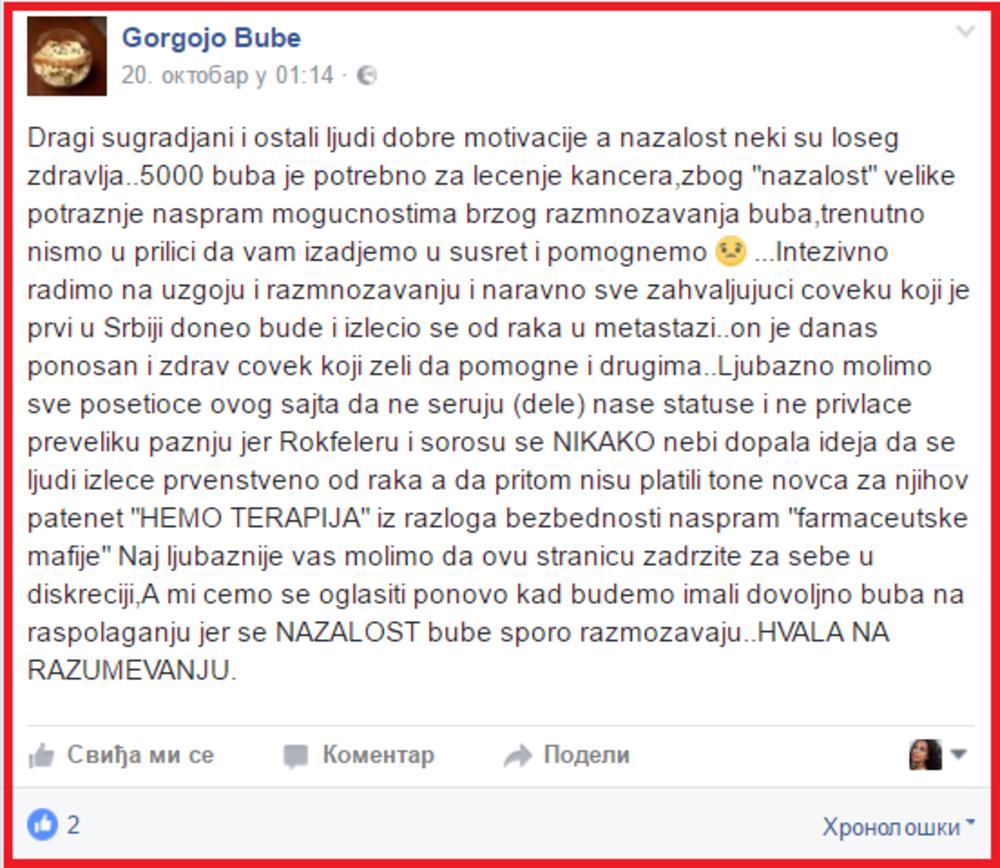 Ipak, na ovom profilu smo pročitali da je za terapiju za lečenje kancera potrebno 5.000 buba. Cena nigde nije pisala...deluje kao da je to STROGO ČUVANA TAJNA!