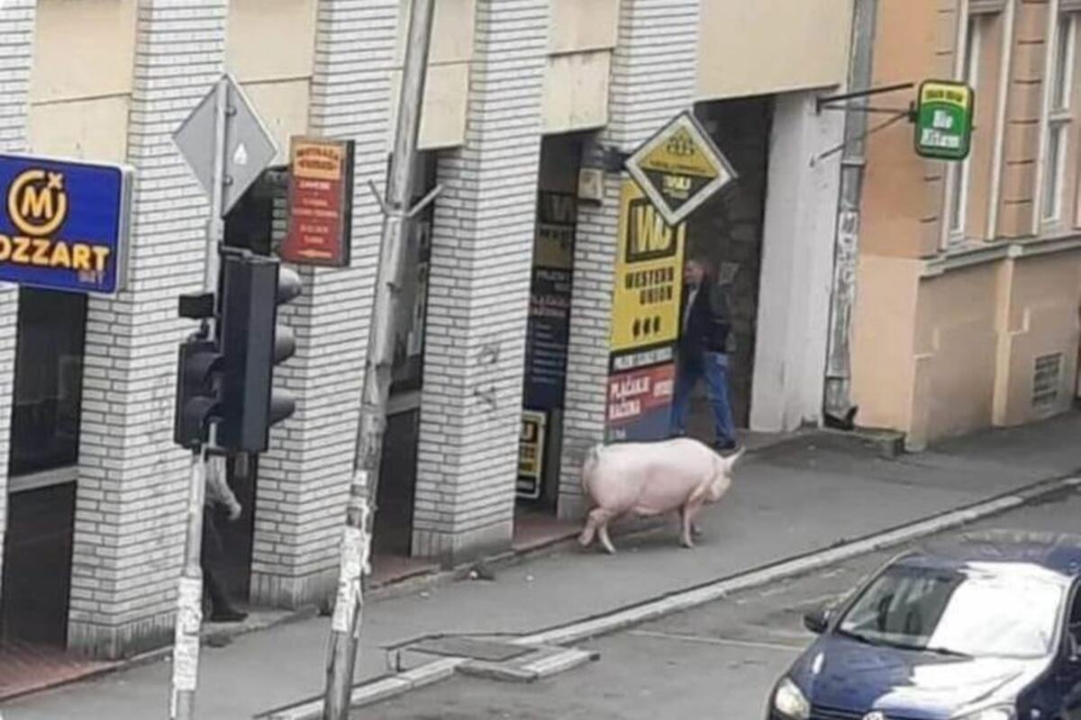 Na fotografiji se vidi kako svinja šeta trotoarom pored parkirališta i u blizini kladionice i radnji koje se tu nalaze