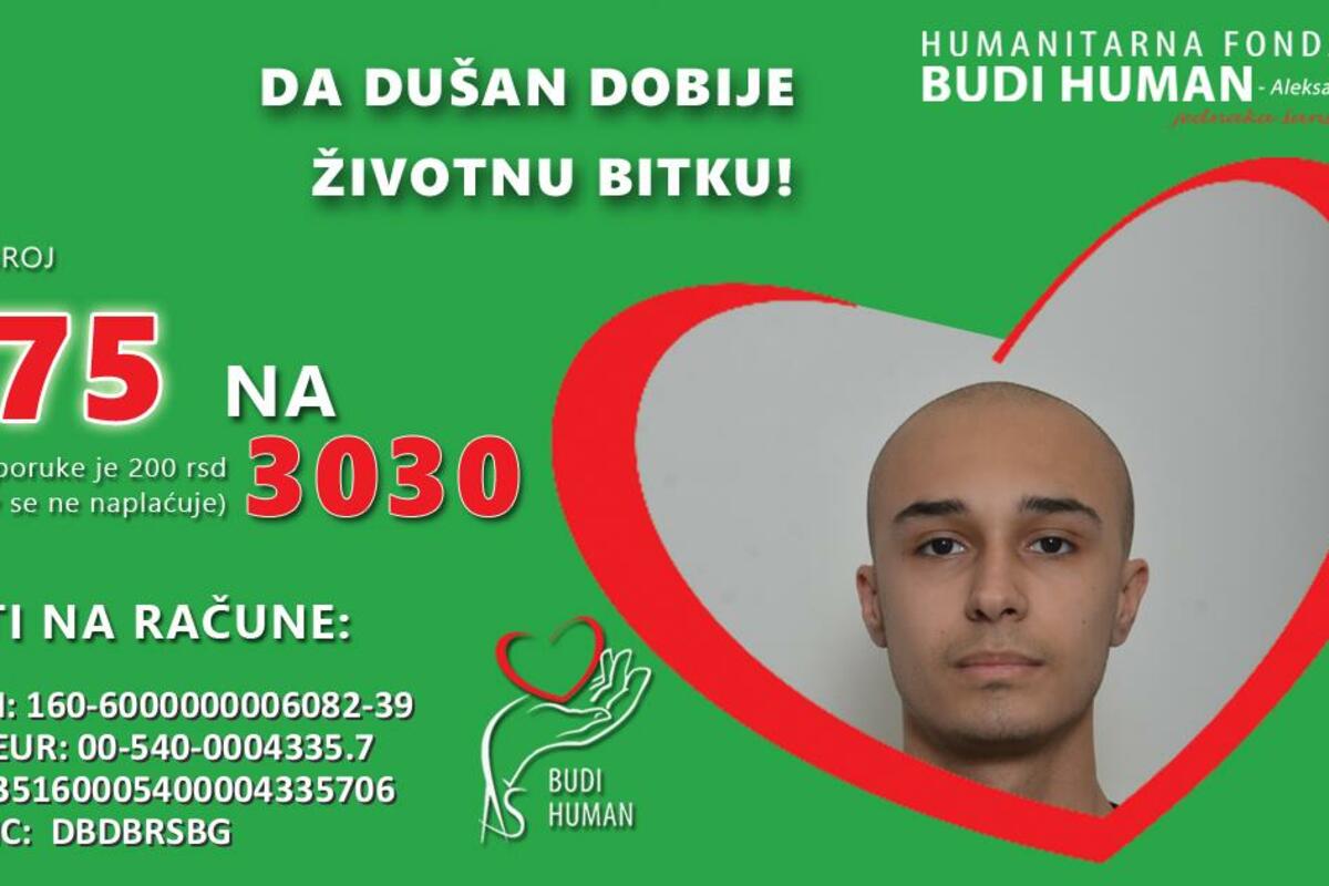 Bez Vašeg učešća, u ovoj trci sa vremenom koji ističe, nećemo uspeti da prikupimo potrebna sredstva. Molimo za Vašu saradnju i podršku u akciji prikupljanja novčanih sredstava putem računa otvorenog preko Fondacije Budi human, kako bi Dušan imao priliku za izlečenjem. Svaki Vaš doprinos je od značaja za Dušanovu bitku.