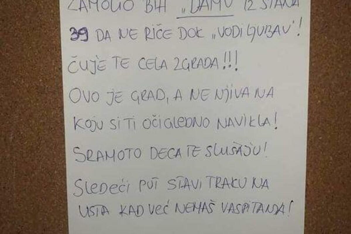 Na kraju poruke, koju je okačio na oglasnu tablu u zgradi, dao je savet "glasnoj komšinici" da sledeći put stavi traku na usta.