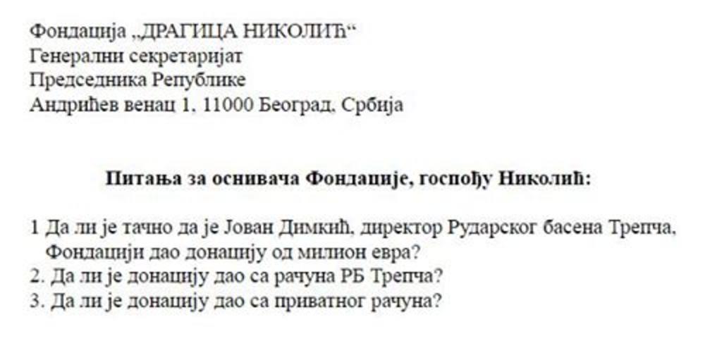Upitao je da li je tačno da je Jovan Dimkić, direktor basena Trepča dao donaciju ovoj fondaciji, od milion evra, kao i sa kog računa je novac stigao, ako je poslat!