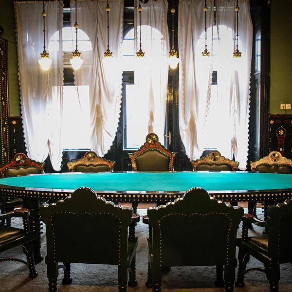 Ona ima simetričnu osnovu sa četiri unutrašnja dvorišta i četiri ulaza. Na severnoj strani, gde se nalaze lepo uređen park i Plava fontana je vestibil sa svečanim stepeništem u mermeru koje vodi do prvog reprezentativnog sprata. Tu su nalaze tri većnice – Zelena i Žuta koje su koristili Veliki župan i Gradonačelnik i treća centralna, najveća i najlepša - svečana Velika većnica. Ona se koristi za zasedanja gradske Skupštine, koncerte, svadbe i važne skupove.