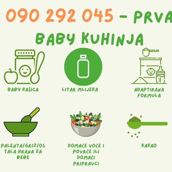 Kako izgleda jedan obrok za bebe? - Bebe korisnice Baby kuhinje svaki dan dobijaju: litar mleka (za bebe starije od godinu dana) kašicu - 7 različitih ukusa za 7 dana u sedmici, ukuse smo pomno birali kako bi bebe imale što raznovrsniju hranu. Kašice su voćne i povrtne, u kombinaciji sa raznim žitaricama itd. Pored kašice, bebe dobijaju i palentu ili griz, čaj ili mleveni keks, keks i biskvite za bebe, zavisno od toga šta je taj dan na jelovniku. Bebe koje ne smeju da doje, a koje su mlađe od godinu dana dobijaju adaptiranu formulu. Vrednost jednog baby obroka je 6 KM. Pored toga, ukoliko imamo sponzora dana, sedmice ili meseca, bebama stavljamo uz obrok i tu donaciju (prvi mesec je to bilo čokoladno mleko koje smo dobili kao donaciju od jedne domaće mlekare).