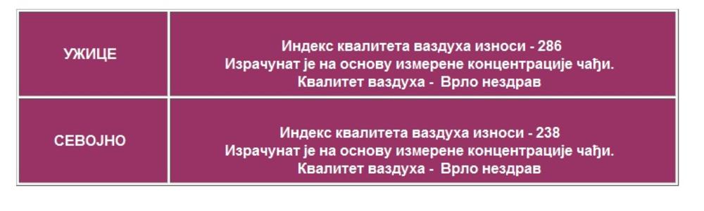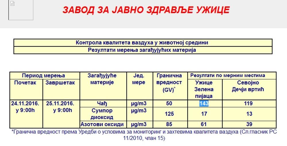 - Na mernom mestu, kod Zelene pijace u Užicu, koncentracija čađi u vazduhu je bila 143 po kubnom metru, u Sevojnu kod Dečjeg vrtića 119 mikrograma, dok gornja dozvoljena vrednost koncentracije čađi iznosi 50 mikrograma - navodi se u poslednjim objavljenim podacima Zavoda od 24. novembra.