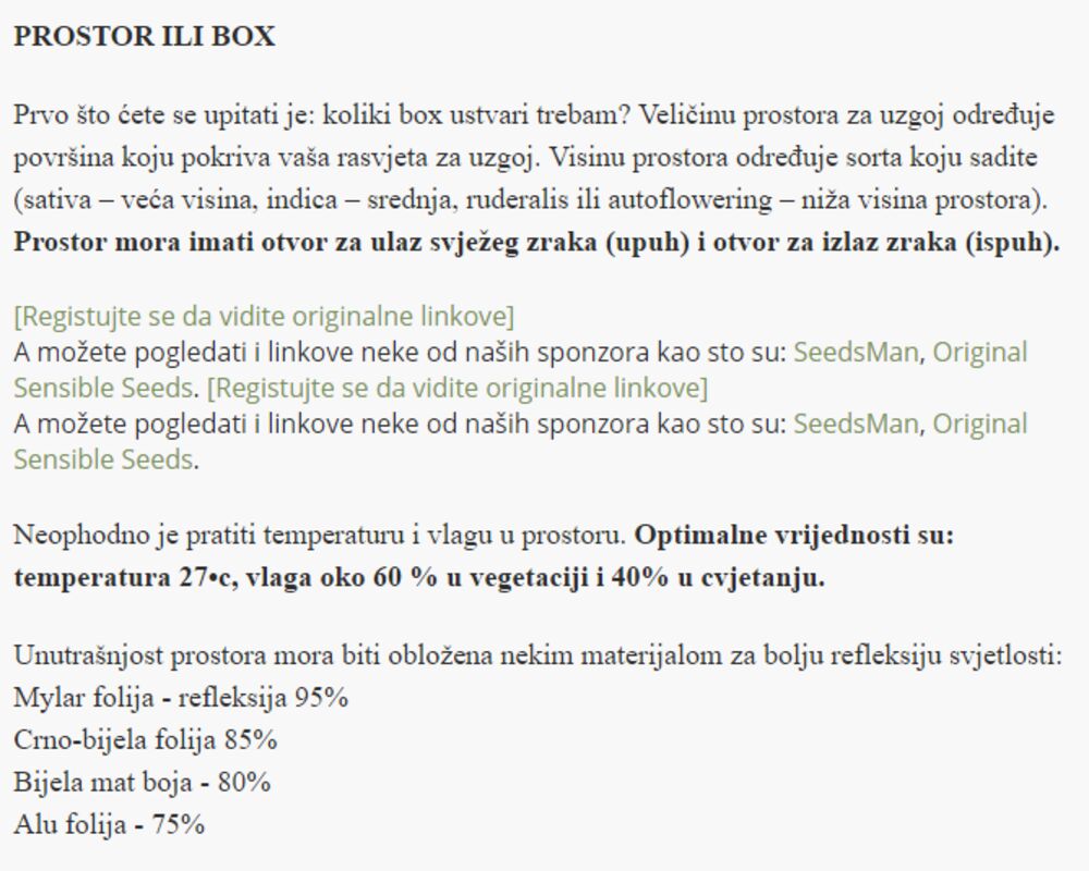 Prvo je do tančina opisan prostor koji pogoduje marihuani, kao i koja je idealna temperatura, vlaga i materijal koji najbolje "upija" svetlost.