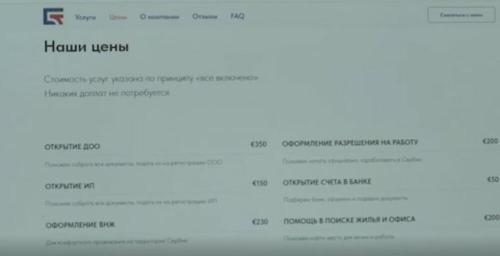 Jedna takva koja posluje u Srbiji, a do koje je RTS došao preko Telegram grupe u kojoj komunicira hiljade Rusa, otvara račun u banci za 50 evra, radnu dozvolu za 200, a firmu kao DOO za 350 evra - piše na njihovom sajtu. Za pomoć u otvaranju preduzetničke radnje naplaćuju 150 evra, i upravo je to najčešći oblik poslovanja koje Rusi biraju.